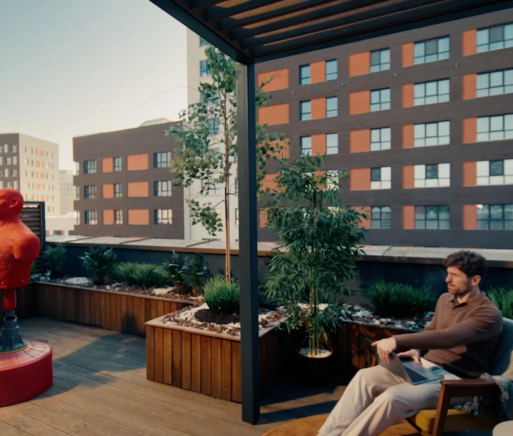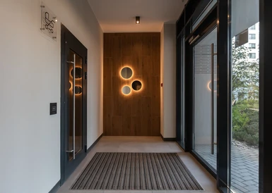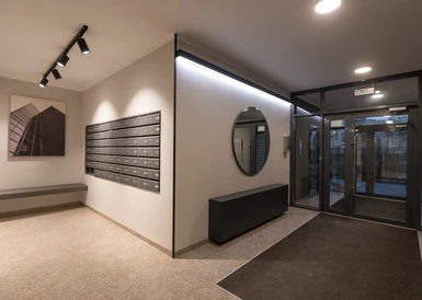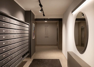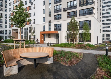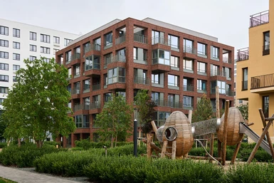 В домах Брусники прозрачные сквозные подъезды. Жители видят, что происходит внутри подъезда и снаружи во дворе. Вход находится на уровне земли. Это удобно велосипедистам, мамам с колясками и пожилым людям.